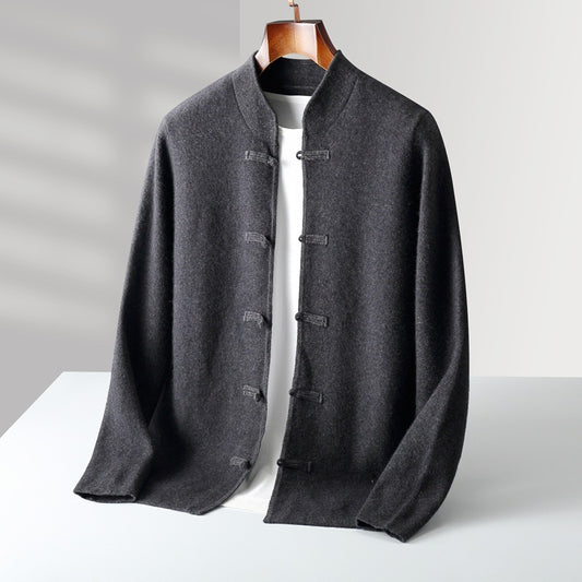 Pure wool sweater long sleeved men's loose and thick stand up collar knitted cardigan jacket