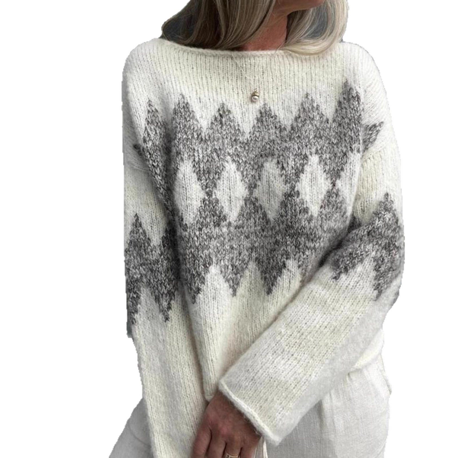 Casual One-Shoulder Pullover Sweater with Color Block Diamond Pattern Knitted Top